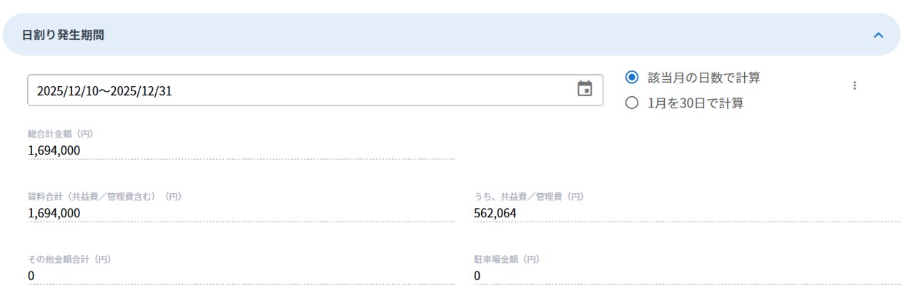 ・日割り発生期間の賃料算出機能を追加しました。